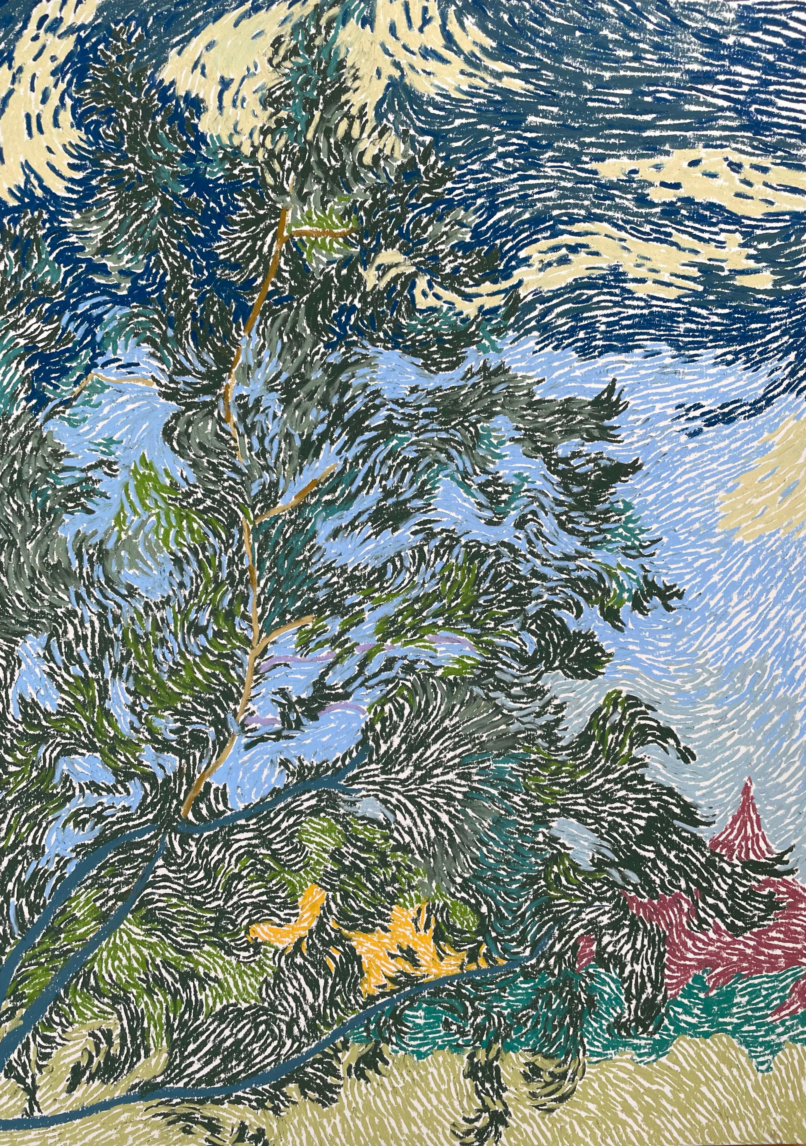Bethan Harris lives and works in Newcastle upon Tyne and graduated from Newcastle University in 2022. She works in both drawing and painting, using colour to create a sense of mood and place. Her work is inspired by nature, memory, and local history, and is built up through repeated marks that give her images a sense of movement and atmosphere.